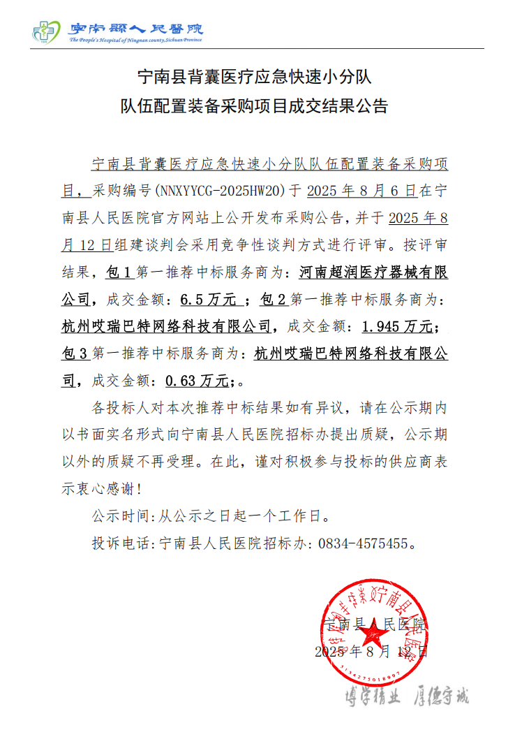 宁南县背囊医疗应急快速小分队队伍配置装备采购项目成交结果公告