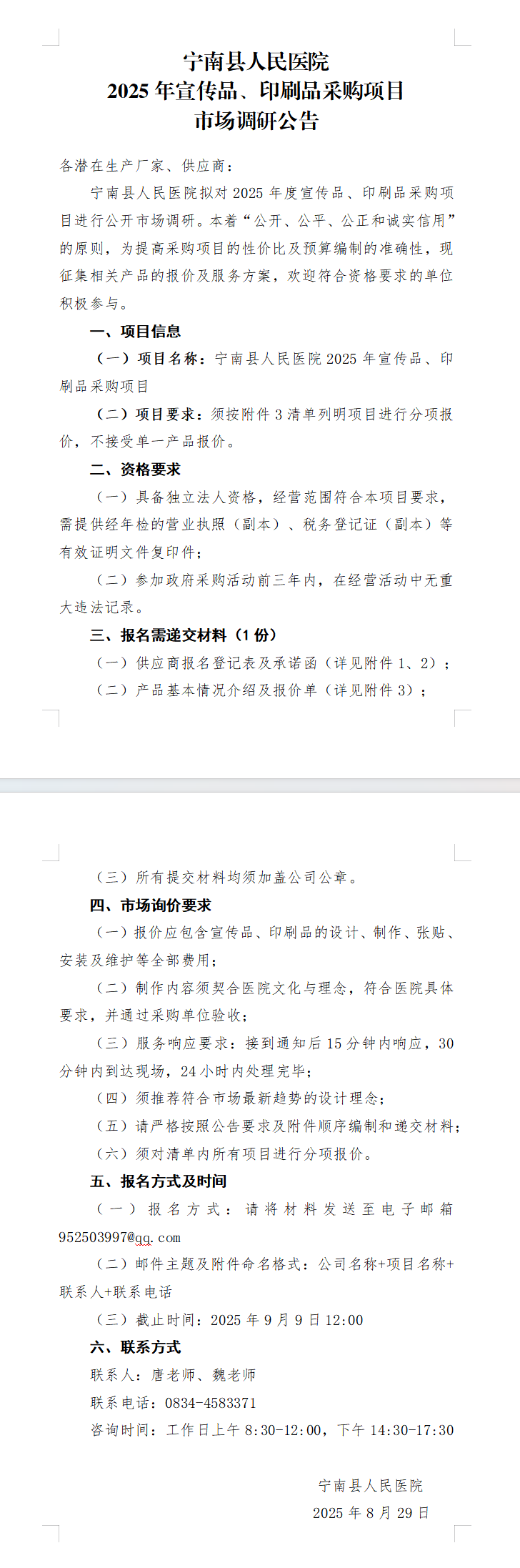 宁南县人民医院2025年宣传品、印刷品采购项目市场调研公告 发布时间: 2025.08.29 来源:官方 附件1、2:供应商报名登记表、承诺函.doc 附件3:宣传物资采购、制作清单及报价(定).xlsx 分享: