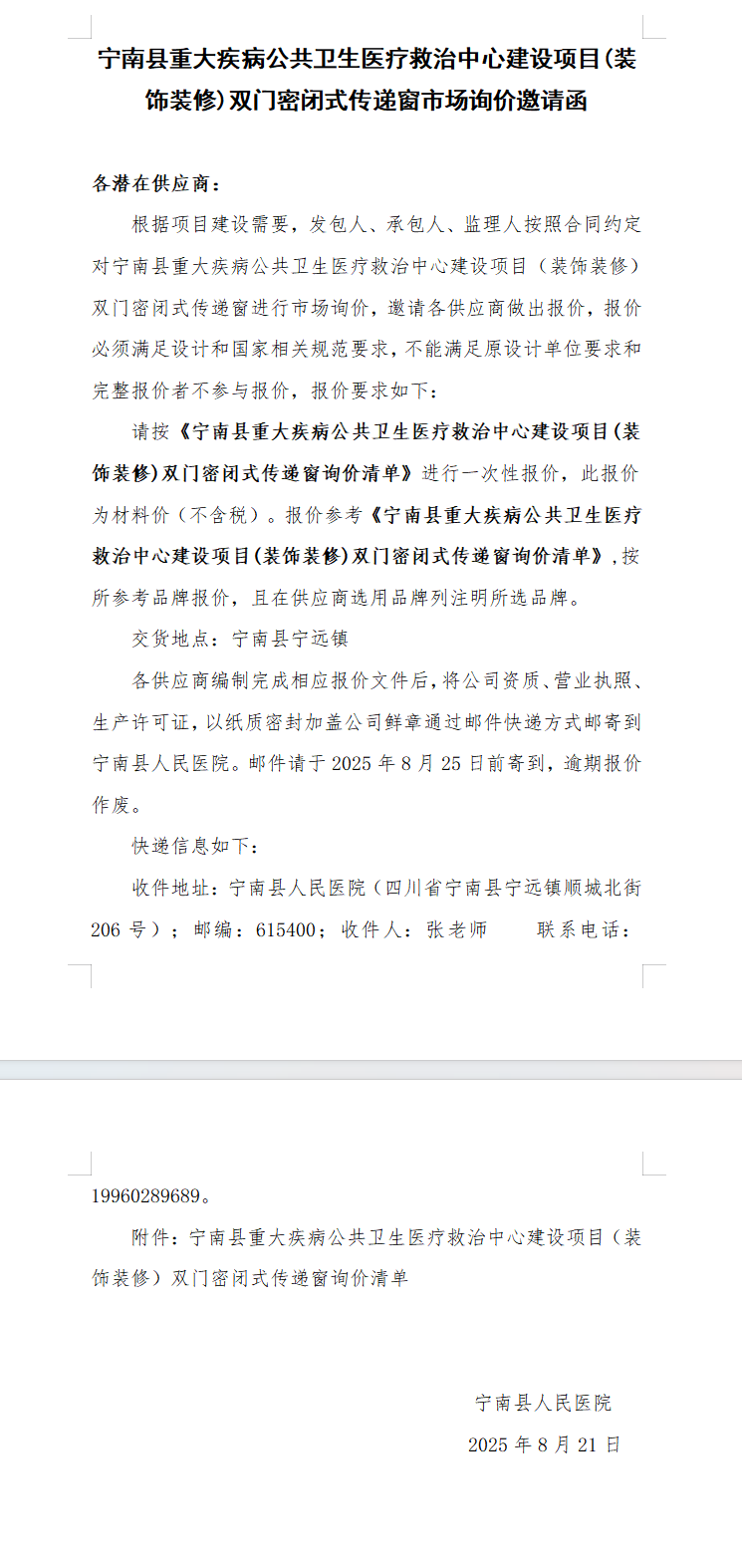 宁南县重大疾病公共卫生医疗救治中心建设项目(装饰装修)双门密闭式传递窗市场询价邀请函 发布时间: 2025.08.21 来源:官方 宁南县重大疾病公共卫生医疗救治中心建设项目(装饰装修)双门密闭式传递窗询价清单.xls 分享: